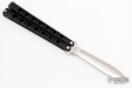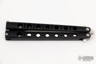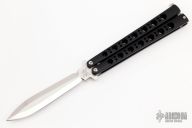 This Model 46 Bali-Song by Benchmade has a dagger blade with a false top edge. Has black coated titanium handles with T-latch. Comes with Benchmade sheath. Has a little bit of wear near the latch, otherwise excellent condition.