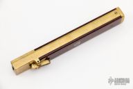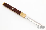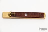 This Gravity Knife by Pabu features a satin finished dagger blade with false top edge. The handle has brass bolsters, brass butt, brass frame, snakewood scales with abalone inlays. Nice function. Has some minor patina and a few light scratches, otherwise excellent condition.  Comes with a zippered case.