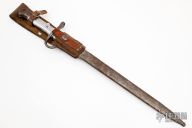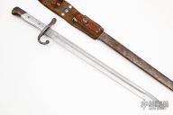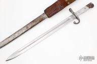 This is a scarce Argentine Contract Mauser M-1891 Bayonet constructed with Aluminum grip panels. Bayonet and scabbard are marked with matching serial number A5429 with RA stamped on both, for República Argentina. The almost 16" blade is in excellent condition, . "MODELO ARGENTINO 1891 A5429" on one side of the blade and "WEYERSBERG, KIRSCHBAUM & CO, SOLINGEN" on the other side. The aluminum grip scales were part of an effort to lighten the bayonet. The grip metal is an alloy of aluminum, with 6 percent copper. Argentina opted for the 15.75 inch blade, after seeing that Chile was going to adopt a shorter (10-inch blade) bayonet for their Mausers. However, the prototype bayonets turned out heavier than the Argentine's liked, so they made a number of design changes (thinner blade, slimmer hilt, and others). They went ahead with the brass grip scales, initially, so as not to further delay production. Brass-gripped bayonets were made 1892–93. Production switched to aluminum grip, mid-1893, after producing 40,000 brass grip bayonets. 190,000 aluminum grip bayonets were made, 1893–1898. Has some scratches and a couple dings, otherwise excellent condition for its age. The scabbard still has an intact frog.