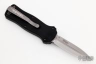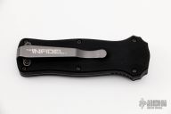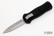 This 3350 Mini-Infidel by Benchmade features a bead blasted, double edge dagger style blade with fullers. The handle is comprised of a black anodized aluminum frame, ramped steel thumb slide and steel tip down clip. Includes original box, papers and nylon sheath. Excellent condition.