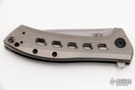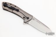 This 0801TI is a Todd Rexford design executed by Zero Tolerance. It features a tumble finished drop point blade with swedge and flipper. The handle is comprised of a titanium frame over black stand-offs. The black coated, deep carry clip can be positioned for left or right hand tip up carry. Excellent condition. #3705