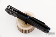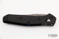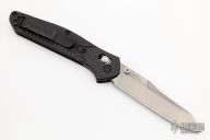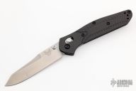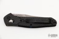 The Warren Osborne designed Benchmade 940 is a popular knife for good reason. It's a comfortable everyday carry knife with its slim design, great ergonomics and lightweight. The 940-1 has a premium CPM-S90V steel blade with a plain edge and a stonewash finish. The carbon fiber handle has stainless steel liners and blue anodized aluminum barrel spacers. The AXIS lock and reversible pocket clip make the knife usable for right and left handers. Excellent condition.