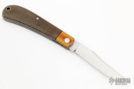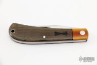This Trapper by Jim Dunlap features a hand rub satin finished blade with nail nick. The handle has natural butterscotch linen micarta bolsters, olive drab canvas covers with black G-10 escutcheon and liners, stainless steel liners and spring. Has half-stops, flush in all positions. Comes with a zippered case and COA dated 11-26-2021. Excellent condition.