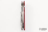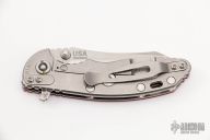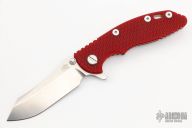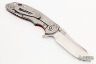 This XM-18 by Rick Hinderer features a stonewash finished blade with notched thumbrest and flipper. The handle has a red G-10 front scale, stonewashed titanium frame, satin hardware, and a tip up or down reversible anodized titanium clip and filler tab, lanyard hole at the butt. Excellent condition. Comes with original box, papers and extra pivot hardware.