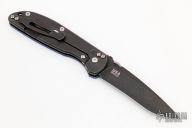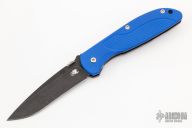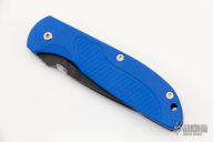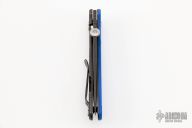 This Firetac by Hinderer features a battle black finished recurve blade. The frame and the blade both have a working finish. The handle consists of textured blue G-10 and battle black titanium frame. The pocket clip is reversible. The thumbdisc is removable; there is a lanyard hole at the bottom. Excellent condition. Comes with original box and extra hardware.