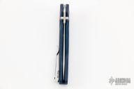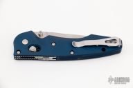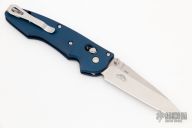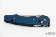 This 477-1 Emissary from Benchmade features a satin finish drop point blade with swedge and dual thumb studs. The handle is comprised of a teal aluminum frame over a stainless steel sub frame. The blade fires out quickly with the assisted opening. Stainless steel tip up clip is reversible for left or right hand carry. Sliding safety on spine. Includes original box, paperwork. Excellent condition.