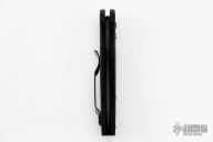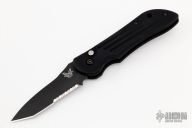 This 9501BK Mini Auto-Stryker from Benchmade features a black coated tanto style partially serrated blade with notched thumbrest. The handle is comprised of black machined aluminum with black coated stainless steel tip up clip and lanyard hole in pommel. Push button release and sliding safety. Includes the original box and papers. Excellent condition.