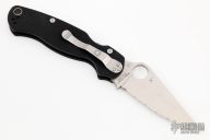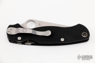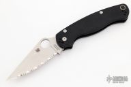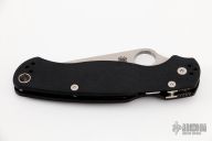 This Paramilitary from Spyderco has a satin finished clip point blade with thumb hole notched thumbrest and serrations. Handle is black G-10 with stainless steel liners and a black stainless steel clip. Excellent condition. Comes with original box and papers.