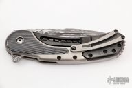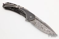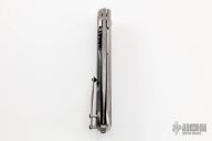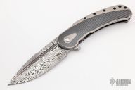 This Bodega flipper by Todd Begg Knives features a Damasteel blade with false top edge. The handle has a hand rub satin finished titanium frame with zirconium inlays with cracked ice finished titanium backspacer, tip up pocket clip and pivot collar. Rides on bearings for smooth and fast opening that requires no wrist action. Outstanding work. Has a few scratches, otherwise excellent condition. Comes with original box and COA dated August 23, 2017.