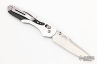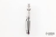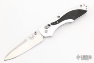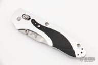 This axis lock folder by Benchmade features a drop point stonewash finished blade with dual thumb studs. Silver aluminum handle, black G-10 inserts with 2 balls in G-10 and anodized purple aluminum backspacer, tip up reversible stainless steel clip. Great function, strong lock up, nice blade seating. Comes with soft pouch. Excellent condition.