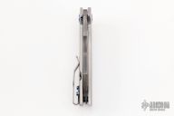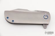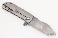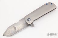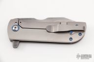 This tanto Spur flipper from Jamie Simeon/Simeon Custom Knives features a duplex ground blade with hamon and flipper. The handle is comprised of bead blasted titanium frame over blue anodized titanium barrel spacers with matching hardware. Bead blasted titanium tip up clip. Great blade seating, detent and lock up. Comes with original case. Has a few marks on the blade, otherwise excellent condition.