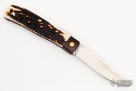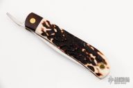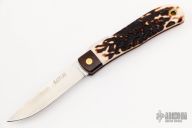 This friction folder by Yoshimi Kotoh features a satin finished blade with friction folder style opening. The handle has ironwood bolsters, stag scales and ironwood liners and trough, lanyard hole at the butt. Comes with a leather pouch. Excellent condition.