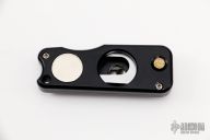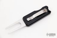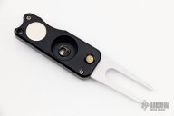 GT Knives' Divotmaster is the ultimate golf gizmo. Its handle is aircraft- grade aluminum, the divot key is stainless steel and the button that activates the pop-open device is solid brass. Has a ball marker and a punch cut cigar cutter. Comes with original box. New condition.