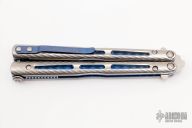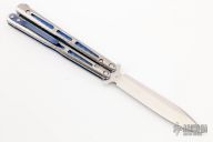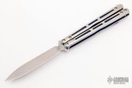 This Model 51 Morpho Balisong from Benchmade has a tumble finished D2 stainless steel spear point blade. Handle has anodized titanium scales by EDC Knives, with anodized liners and clip. Comes with drawstring pouch. Excellent condition.