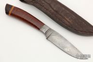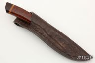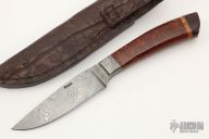 This hunter by David Brodziak features a Damascus blade with integral guard, .188" blade stock and 1.177" blade depth, hidden tang construction. The handle has a lace wood grip with ironwood burl butt and a quilted maple spacer. Includes brown leather sheath. Has a little gap between the guard and grip, otherwise excellent condition.