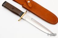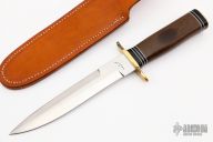 This SG2 Fighter by Enedino De Leon features a satin finish blade with a sharpened top edge, .210" blade stock and 1.303" blade depth, hidden tang construction. The handle has a brass guard and butt, green linen micarta grip with black and white spacers. Includes a brown leather sheath. Has some patina on the guard, and a couple of light stains on the ricasso, otherwise excellent condition.