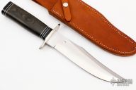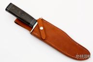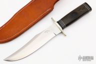 This JB Bowie by Enedino De Leon features a satin finish blade with a sharpened top edge, .199" blade stock and 1.705" blade depth, hidden tang construction. The handle has a nickel silver guard and butt, green linen micarta grip with black and white spacers. Includes a brown leather sheath. Has some patina on the guard, otherwise excellent condition.