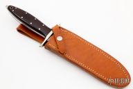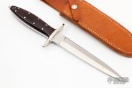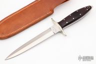 This Dagger from Enedino De Leon features a satin finished double edge blade with .203" blade stock and 1.017" blade depth, full tang construction. The handle is comprised of a nickel silver guard and black linen micarta scales with nickel silver pins and lanyard tube over white liners and full tang construction. Includes a brown leather sheath with belt loop. Excellent condition.