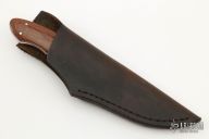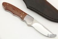 This Hunter by Steve Knott features a mirror polished blade with satin flats and false top edge, .162" blade stock and .929" blade depth, full tapered tang construction. The handle has satin finished stainless steel dovetailed bolsters, brown canvas micarta scales. Comes with a brown leather sheath. Excellent condition.