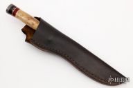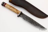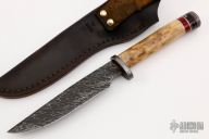 This Hunter from Stek Knives features a Cable Damascus blade with false top edge, .162" blade stock and 1.227" blade depth, hidden tang construction. The handle is comprised of a Damascus guard, oosic grip and buffalo, jasper and nickel silver spacers with a Damascus pommel. Includes a black leather sheath and COA dated December 2005. Has a few little oxidation spots, otherwise excellent condition.
