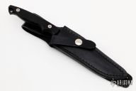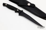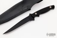 This Fighter by John Greco features a black coated blade with swedge, .207" blade stock and .977" blade depth, full tang construction. The handle is comprised of black aluminum scales over full tang construction with lanyard hole. Includes a black leather sheath. Excellent condition.