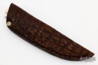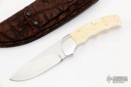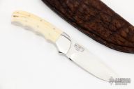 This knife by George Muller features a hand rub satin finished blade with mirror polished flats, .156" blade stock and .969" blade depth, full tang construction. The handle has nickel silver bolsters, warthog tusk scales. Comes with a brown leather sheath, it may not be the original sheath, it is a little too big, but it is a George Muller sheath. Has a few light scratches, otherwise excellent condition.