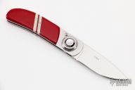 This Paul Pocket Knife features the Paul Poehlmann axial locking mechanism. Opens by depressing the button on the backside and rotating the face side dial. Closes the same way, rotating the dial in the opposite direction. The handle is comprised of red coral and opal scales over stainless steel liners and backspacer. Excellent condition. Includes original box, leather sheath and papers.