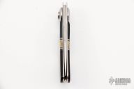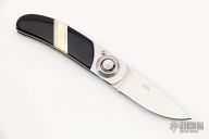 This Paul Pocket Knife features the Paul Poehlmann axial locking mechanism. Opens by depressing the button on the backside and rotating the face side dial. Closes the same way, rotating the dial in the opposite direction. The handle is comprised of Gold lip Pearl and Mother of Pearl and Black Jet scales over stainless steel liners and backspacer. Excellent condition. Includes original box, leather sheath and papers.
