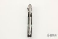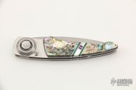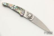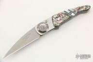 This Paul Perfecto from Lone Wolf Knives features a bead blast wharncliffe style blade. The handle is comprised of abalone/pearl/malachite/purple turquoise overlays over a stainless steel frame and barrel spacers. Pivot features the Paul Axial Locking Mechanism. Excellent condition. Comes with original box, sheath and papers.