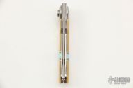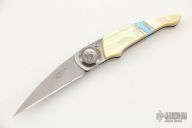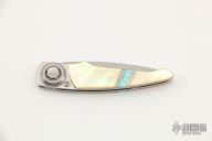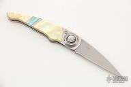 This Paul Perfecto from Lone Wolf Knives features a bead blast wharncliffe style blade. The handle is comprised of gold lip pearl and opal overlays over a stainless steel frame and barrel spacers. Pivot features the Paul Axial Locking Mechanism. Excellent condition. Comes with original box, sheath and papers.