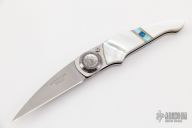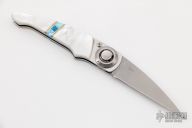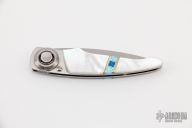This Paul Perfecto from Lone Wolf Knives features a bead blast wharncliffe style blade. The handle is comprised of mother of pearl and opal overlays over a stainless steel frame and barrel spacers. Pivot features the Paul Axial Locking Mechanism. Excellent condition. Comes with original box, sheath and papers.