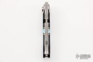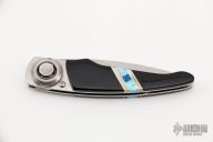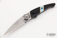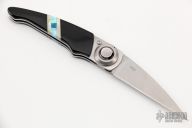 This Paul Perfecto from Lone Wolf Knives features a bead blast wharncliffe style blade. The handle is comprised of black jet, mother of pearl and opal overlays over a stainless steel frame and barrel spacers. Pivot features the Paul Axial Locking Mechanism. Excellent condition. Comes with original box, sheath and papers.