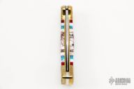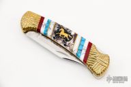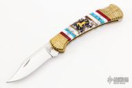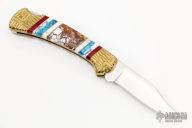 This Buck Model 112 has been customized by Brian Yellowhorse. The blade features a mirror polished clip point blade with a single nail nick. The handle features a carved brass frame with multi piece inlays. Includes original box and papers. Excellent condition. #15/20