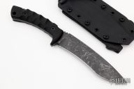 This Kraken by Rustic Knives features an acid tumble finished blade with notched thumbrest, .195" blade stock and 1.487" blade depth, full tang construction with black G-10 scales. Comes with a kydex sheath. Excellent condition.