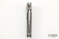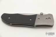 This Inferno by Kirby Lambert features satin finished recurve blade with swedge, dual thumbstuds and notched thumbrest. This knife features bead blasted titanium bolsters, carbon fiber scales, bead blasted titanium liners, titanium barrel spacers, and a stainless steel clip positioned for tip-down carry. Nice detent, lockup and blade seating. Excellent condition.