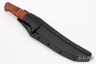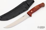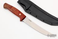 This knife by Dan Crotts features a satin finished blade, .089" blade stock and .980" blade depth, full tang construction. The handle has cocobolo wood scales with a copper pin and laynard hole. Comes with a kydex sheath with belt loop. New from maker!