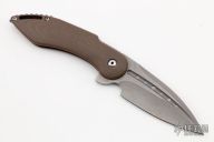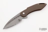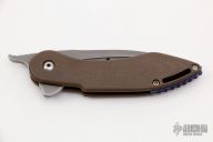 This Glimpse friction folder by Begg Knives features a bead blasted blade with fullers and notched thumbrest, false top edge. The handle has brown G-10 scales with a titanium backspacer with lanyard hole. Comes with nylon zippered case. Excellent condition.