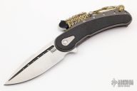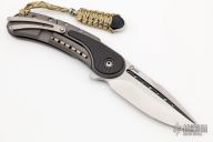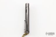 This Bodega flipper by Todd Begg Knives features a satin finished blade with a false top edge. Bead blasted titanium frame with carbon fiber inlays with cracked ice finish, matching titanium backspacer, tip up pocket clip and pivot collar. Includes IKBS (Ikoma-Korth Bearing System) for smooth and fast opening that requires no wrist action. Outstanding work. Has a light scuff on the frame, otherwise excellent condition. Includes a Velcro case.