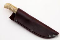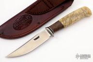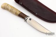 This Bird and Trout by James Behring features a satin finished convex blade with .116" blade stock and .905" blade depth, hidden tang construction. The handle has a nickel silver guard, musk ox grip with cocobolo/white/black spacer pattern. Comes with a brown leather sheath and a zippered case. Excellent condition.