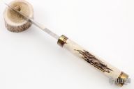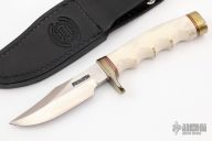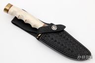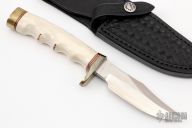 This Stanaback Special from Randall Made Knives features a satin finished clip point blade with sharpened top edge and notched thumbrest, .219" blade stock and 1.059" blade depth. The handle is comprised of a brass guard and butt with finger grip style stag over hidden tang construction. Includes a hand tooled black leather sheath with belt loop and a zippered case. Has a scratch on the blade, otherwise excellent condition.