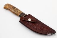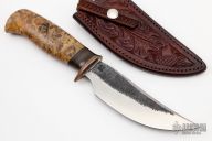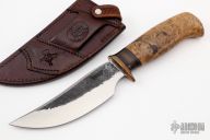 This Hunter by James Behring features a satin finished and hammer marked blade with false top edge, .194" blade stock and 1.662" blade depth, hidden tang construction. The handle has a copper guard, golden amboina burl wood grip with copper pin and black/copper/black linen micarta spacers. Comes with a hand tooled brown leather sheath by Kenny Rowe's Leather. Comes with a zippered case. Excellent condition.