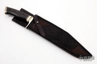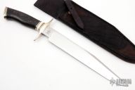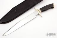 This Fighter by Ben Browning features a mirror polished blade with a false top edge and fileworked spine, .178" blade stock and 1.355" blade depth, hidden tang construction. The handle has a nickel silver guard and butt, wood grip with black, stainless steel and mammoth ivory spacers. Comes with a hand tooled black leather sheath. Excellent condition.