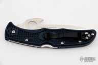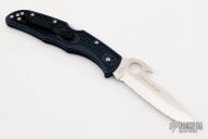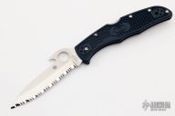 This Spyderco Endura has a satin finished fully serrated blade, thumbhole, wave feature and notched thumbrest. Has dark grey FRN handle with black stainless steel clip, 4-way reversible. Includes original box and papers. Excellent condition. Discontinued.
