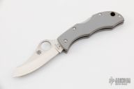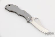 This Jester by Spyderco features a satin finished blade with thumbhole and notched thumbrest. The handle has grey G-10 scales, stainless steel liners and backspacer, lanyard hole. Comes with original box and papers. Excellent condition.