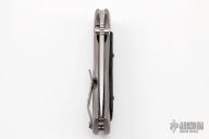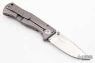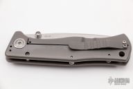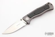 This Rexford Epicenter by Boker has been converted to a scale release D/A auto by Butch Vallotton. Hand rub satin finished blade with dual thumbstuds and a notched thumbrest. The handle has a bead blasted titanium frame with carbon fiber scale and a tip up titanium clip. Has some scuffs and scratches, otherwise excellent condition. Comes with original box. #3