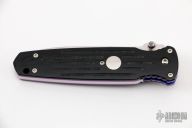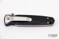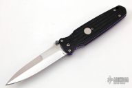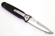 This Applegate Fairbairn Covert Auto by Butch Vallotton features a mirror polished spear point blade with false top edge, dual thumb studs and notched thumbrest. The handle has milled black G-10 scales over anodized titanium liners and stainless steel backspacer. Polished stainless steel tip down clip and lanyard hole in pommel. Stamped "99 #56" on "B" side of blade. Comes with a velcro case. Has a couple very light scratches, otherwise excellent condition.