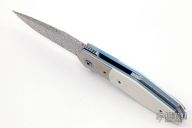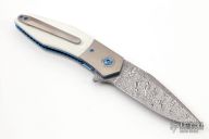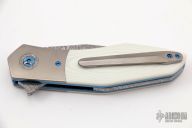 This Accomplice linerlock flipper from Steven Skiff features a Damasteel blade with a false top edge notched thumbrest. The handle has orange peel finished titanium bolsters and tip up clip, ivory G10 scales, and anodized titanium liners.  The backspacer is Damasteel. Very smooth action with a nice detent, lockup and blade seating. Excellent condition.