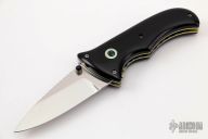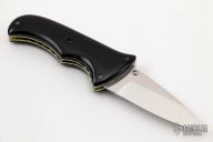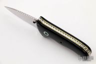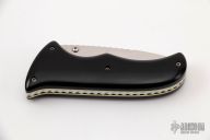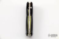This Maahes D/A prototype by Nate Clark features a mirror polished blade with filework on blade spine and a single thumbstud with onyx inlay. Black paper micarta scales, abalone inlay in push button, anodized titanium liners with jeweled interiors, fileworked stainless steel backspacer. Offers both smooth manual action and strong leaf-spring automatic action. Nice detent, action, lockup and blade seating. Excellent work. Marked "Prototype" on interior. Excellent condition.