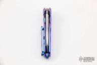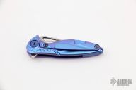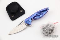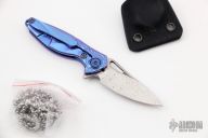 This Hummingbird Flipper by Rike Knife features a Damasteel blade with thumbhole, notched thumbrest and flipper. The handle has an anodized and milled titanium frame with matching tip up clip and a blue anodized titanium backspacer, has stainless lockface insert. Nice detent, lockup and blade seating. Rides on caged bearings. Comes with original box and neck sheath. Excellent condition.