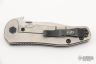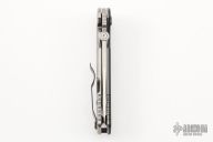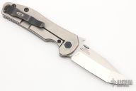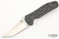 This 0620CF Emerson Tanto by Zero Tolerance features a satin finished tanto blade with thumbdisc and wave feature. The handle has a carbon fiber front scale with single stainless steel liner, tumbled titanium lockside, stainless steel lockface insert, black stainless steel tip up clip, left or right reversible. Has some scratches and the clip is bent out a touch, otherwise good condition. S/N 4044.
